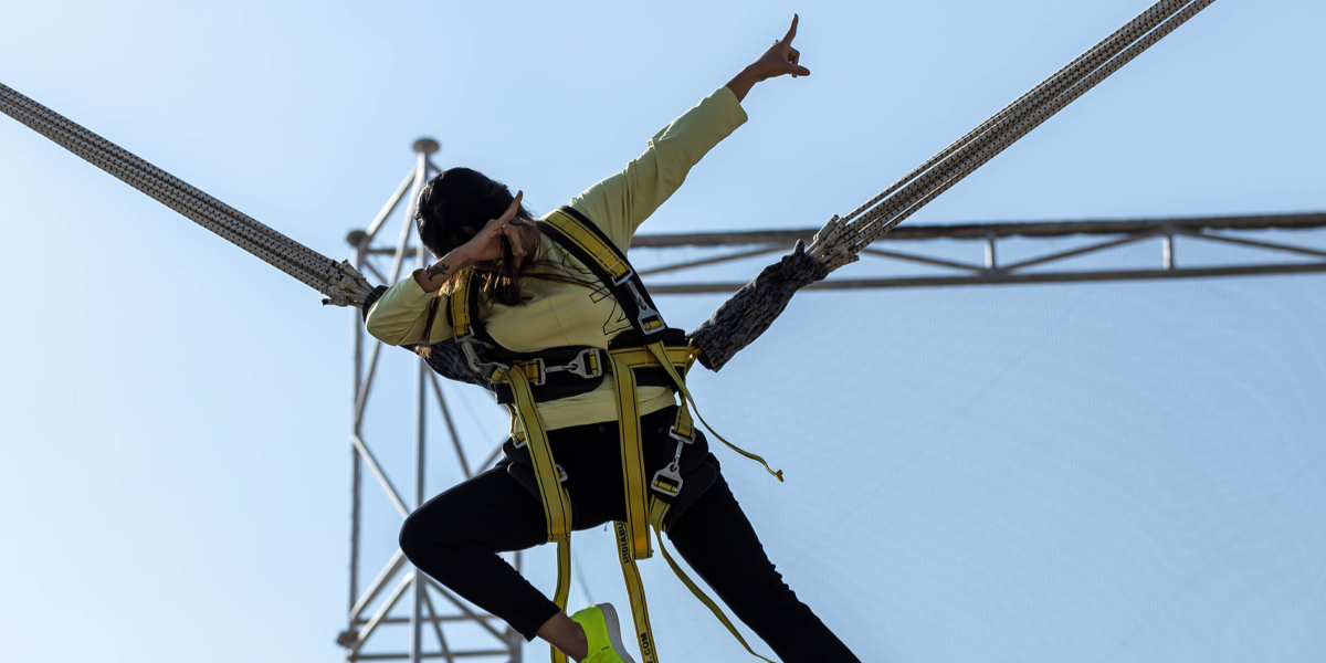 - A full body harness will be attached to the participant. The elastic ropes and the carabineers of the systems are checked and tested on daily basis.